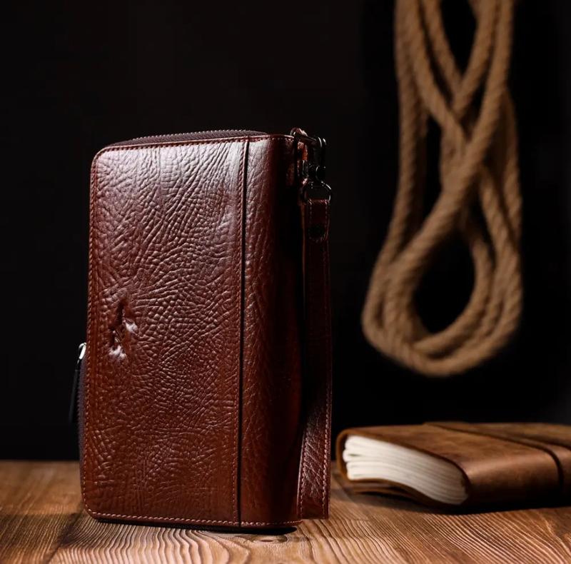 Цвет: коричневый; Материал: натуральная кожа высокого качества; Размер (ШхВхГ, см): 21х12,5х4см; Страна производитель: Турция. Артикул: 20854 Описание: - два автономных отдела на молнии; - в первом отделе расположены два отдела для купюр или документов, карман на молнии посередине; - во втором отделении расположено 13 отделений для карточек, скрытый отсек для документов, карман для мобильного телефона; - снаружи на тыльной стороне мужского клатча расположена ручка для переноса в руке; - съемный кистевой ремень из натуральной кожи; - мужской клатч упакован в фирменный текстильный мешок Karya. Многофункциональный мужской клатч из натуральной зернистой кожи с использованием добротного текстиля (внутренняя подкладка). Носится с помощью ремешка на запястье или просто в руке. Используется качественная фурнитура цвета темного серебра. Борсетка одновременно, компактная и функциональная. С таким аксессуаром мужчина будет выглядеть солидно и уверенным в себе.