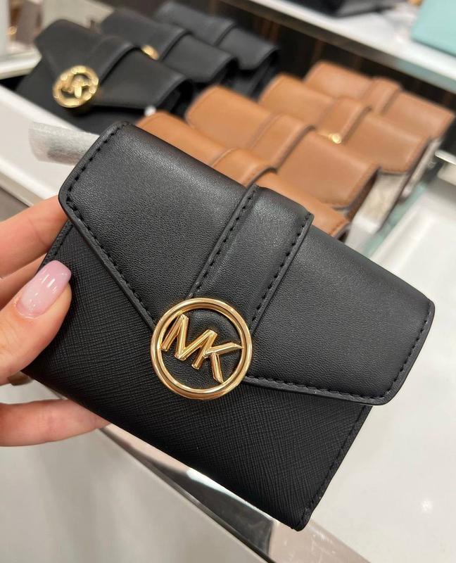 Кошелек, женский Michael Set Medium Slim Bifold Wallet Майкл Корс Оригинальный Цвет: черный Материал: кожа ( канва ) Одно основное отделение,одное отделение на молнии, 6 слотов для карт. Замеры : длина 12 см, ширина 10 см.(в развернутом виде 16 ширина)