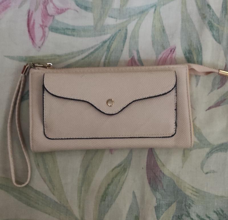 Кошелек бежевого цвета, вместительный, имеет широкое отделение для наличности, монет и карточек, на передней стороне кошелька есть дополнительный внушительный карман и карабин с недолгой ручкой. Кошелек новый. Отправлю новой почтой /укр по почте.