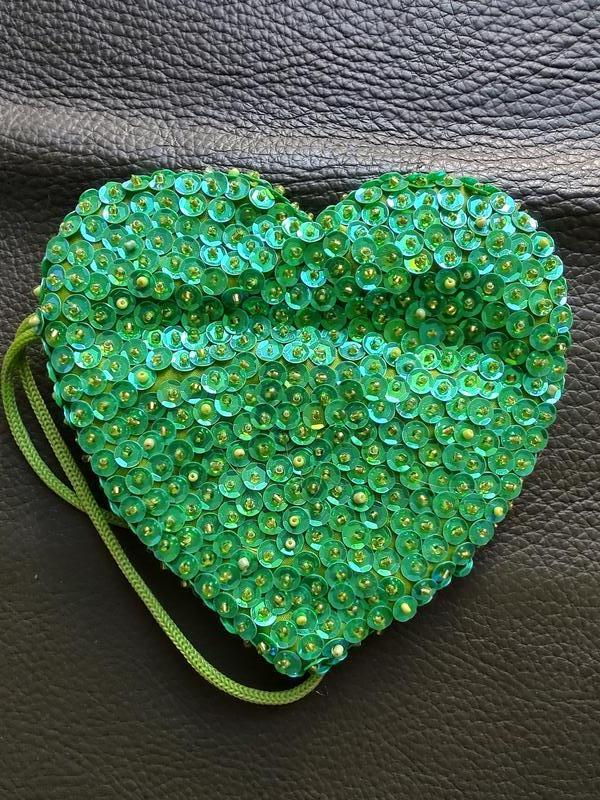 Монетница, кошелек сердечко, расшитое пайетками и бисером. Подкладка в середине имеет небольшие пятнышки.