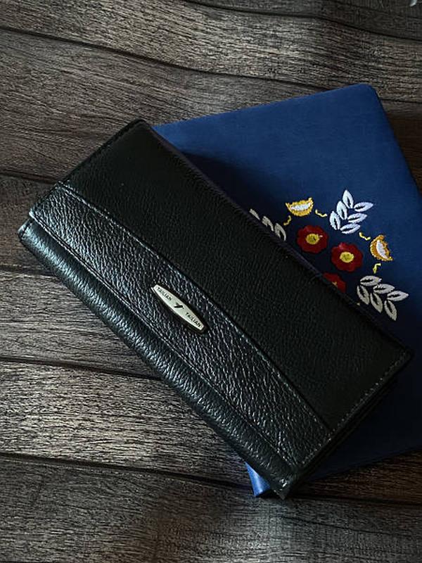 Гаманець виготовлений із натуральної шкіри. Виріб горизонтального типу із великою кількістю різних відділень. Є відділення для купюр, карт, документів та монет. Закривається гаманець на кнопку. Рівні, якісно прошити шви підкреслюють надійність виробу. Монетниця закривається на фермуар. Є спеціальне відділення для документів із прозорим віконцем. Підійде як для особистого користування, так і для подарунка. Лицьову сторону прикрашає емблема під назвою бренду. З тильного боку кишеня відкритого типу. Запакований гаманець у фірмову картонну коробку. Розмір: 9 х 19 х 3 см Матеріал: Натуральна шкіра Кількість відділень: - 3 основні відділення для купюр - 1 прихована кишеня - 9 слотів для банківських карток T806-H09 - 1 відділення для документів із прозорим віконцем - монетниця - 1 кишеня зовні Застібка: кнопка