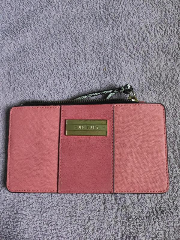 Женский кошелек разового цвета, раскладывается как книжка, имеет одно отделение на молнии, два отделения для купюр, четыре отделения для карточек. Внутри комбинированная отделка разового с чешуйчатым бело серым