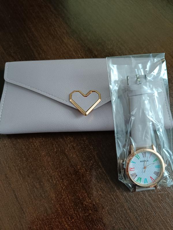 Новый женский комплект, состоящий из кошелька и часов, в узком цвете. Кошелек имеет два отделения для купюр, одно большое для монет, закрывается на кнопку. Циферблат диаметром - 3.8 см