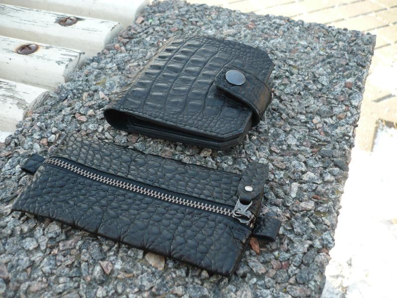 Комплект: кошелек бифолд и ключница. Изделия из двух видов кожи в черном цвете. Внешняя часть: кожа ВРХ с тиснением "Беби крокодил" производство Турции; внутренняя часть: кожа ВРХ "crazy horse". Прошитый вощеной нитью galaces 0,45 мм. Ручная работа. Ценность: 1100 грн. Кошелек - 1 отделение для купюр, 4 кармана для карт, монетница. Размер: 105*100 мм. Ключница - Размер 140*65 мм. Молния и собачка YKK (Япония).