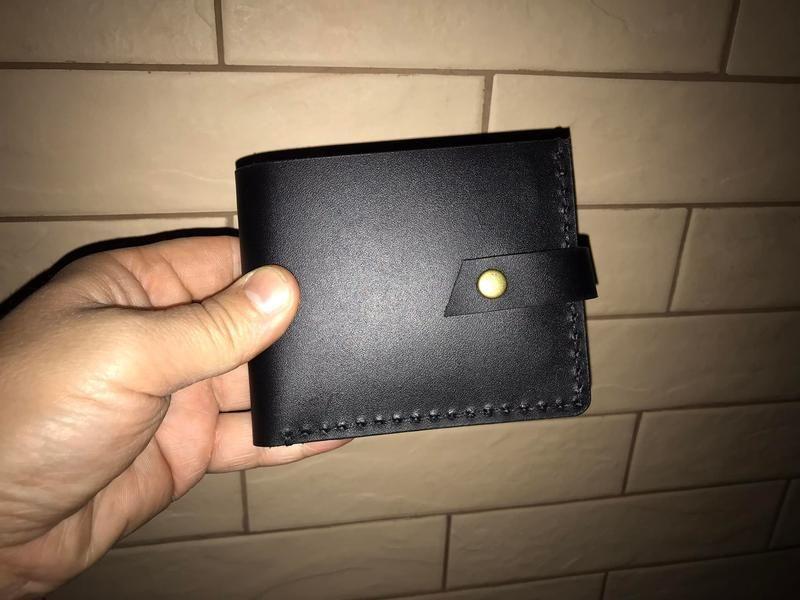 Шкіряний чоловічий гаманець чорного кольору. Великий відділ для паперових грошей, дві кишені під картки, монетниця. Застібається на кнопку.