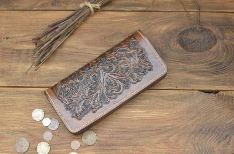 Вы устали от поисков подарка? Тогда Вам к нам. Коротко о кошелке. Кожа растительного дубления. Ручная гравировка по коже, ручная покраска и сборка. Сшит седельным швом вощеными нитками. Кошелек очень вместительный. Размеры 20см х 12см х 3см. Когда наполнен – толще.Отделения под карточки, под купюры. Кошелек застегивается на прочные кнопки из латуни. Вмещает очень много денег – для любителей носить наличные с собой.Точное повторение невозможно. Перед вами – настоящая ручная работа, и вы можете быть уверены, что не встретите такой же кошелек у ваших друзей и знакомых. Поверьте, кошелек никого не оставит равнодушным. Вот уже шесть лет я работаю с кожей. Благодаря этому я добился, что блокноты будут долго радовать вас. Дополнительные характеристики: Пол: Женский Пол: Унисекс Цвет : Коричневый Материал : Кожа Тип: Кошелек двойного сложения Количество отделений для купюр: 3 отделения Количество отделений для купюр: 4 отделения Персонализация : С тиснением Тип застежки: На кнопках Товар под заказ