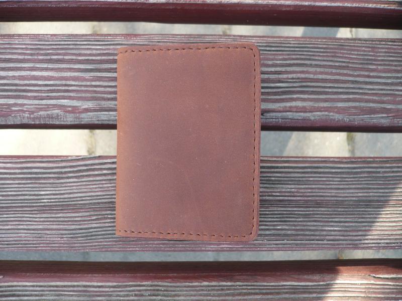 Обкладинка для ID паспорта, автодокументів або пластикових карток. Шкіра ВРХ "crazy horse", колір коричневий-віскі. Дві кишені для карток. Розмір : 75*100 мм. Обкладинка прошита вощеною ниткою. Ручна робота. Цінність: 280 грн.