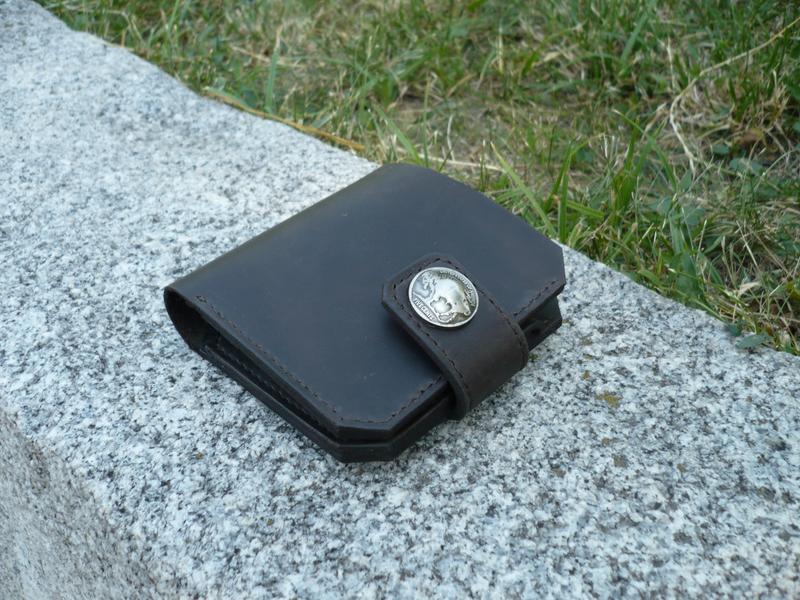 Гаманець біфолд . Шкіра ВРХ ′crazy horse′, колір темно коричневий . Одне відділення для купюр, 4 кишені для карток, монетниця. Розмір: 105*100 мм. Прошитий вощеною ниткою galases 0,45 mm. Уріз оброблений і відполірований. Фінішне покриття - крем IEXI wrens dubbin. Ручна робота. Ціна 760 грн.