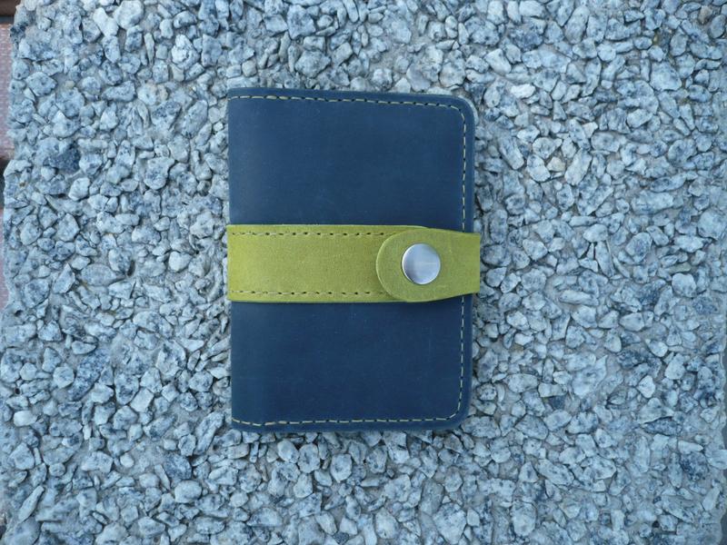 Картхолдер для ID документів, банківських або пластикових карток. Шкіра ВРХ «crazy horse», колір синьо зелений. Фінішне покриття – крем iexi wrens dubbin. Картхолдер прошитий вощеною ниткою 0,35 мм. Розмір: 75*105 мм. Ручна робота. Цінність: 400 грн.