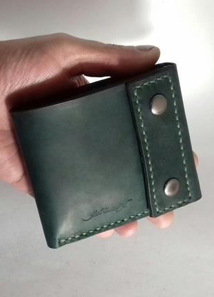 Гаманець з натуральної шкіри, з клапаном на двох кнопках,темнозеленого кольору прошитий в ручну міцною провощеною ниткою. Шість відділення для купюр табо відділення для купюр. Розмір гаманця 9.5см 11см Повністю ручна робота Додаткові характеристики: Стать: Унісекс Колір: Зелений Матеріал: Шкіра Тип: Гаманець подвійного складання Кількість відділень для купюр: 1 відділення Тип застібки: На кнопках Розмір: Середній