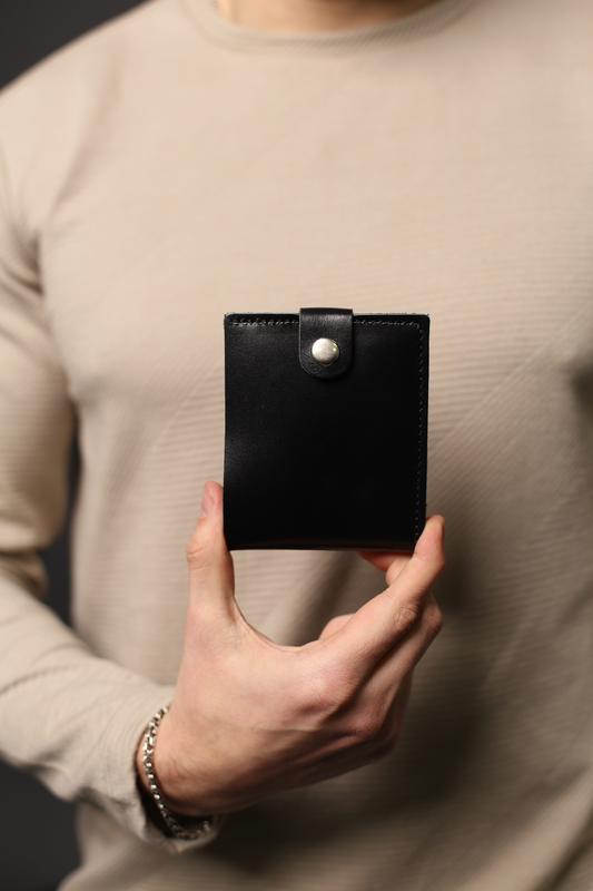 СТРУКТУРА: • одно отделение для купюр • 3 ячейки для карт • монетница на кнопке ХАРАКТЕРИСТИКИ: - материал: натуральная кожа - вид кожи: гладкая - Цвет: черный - Тип модели: кошелек - Фурнитура: металлические кнопки (2) - Размер: (В*Ш*Г) - 9см*11см*1см