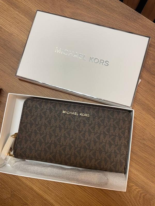 Большой кошелек из коллекции MICHAEL Michael Kors. - Застегивается на молнию. - Отсеки для карт. - Отделение для купюр. - Карман для монет на молнии. - Съемный ремень без регулировки. - Модель в фирменной коробке. - Количество отделений для карт: 3. - Размеры: 10,5 x 18 cm.
