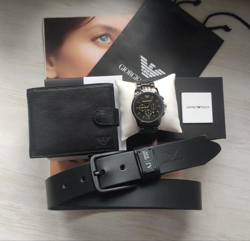Чоловічий подарунковий набір armani шкіряний ремінь, гаманець і годинник black