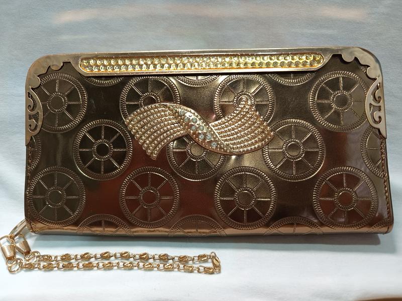 Новый. Кошелек - клатч одевается на руку. Длина 21 см, высота 11 см, ширина 2,5 см. Цвет золото с камушками. Отделение для карт 12 шт, для купюр, для монет, для телефона.