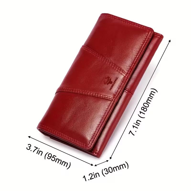 новый, элегантный и функциональный женский кошелек-клатч (купюрник) от бренда HUMERPAUL. Это идеальный аксессуар для тех, кто ценит стиль, емкость и безопасность. Главные преимущества: Материал: Изготовлен из качественной натуральной кожи. Безопасность: Имеет встроенную технологию RFID Blocking (защита от бесконтактного считывания данных). Цвет: Насыщенный красный/бордовый (глянцевая фактура). Характеристики и конструкция: Тип: Длинный кошелек (купюрник/клатч) на три сгиба. Размеры (примерно): Длина: 18 см (7.1 дюймов), Ширина: 9.5 см (3.7 дюймов), Толщина: 3 см (1.2 дюйма). Функциональность: Вместительное внутреннее наполнение с отделениями для купюр, многими слотами для карточек и карманом на молнии с обратной стороны для монет или мелочей. Этот кошелек является отличным вариантом для подарка. Состояние: Новый.