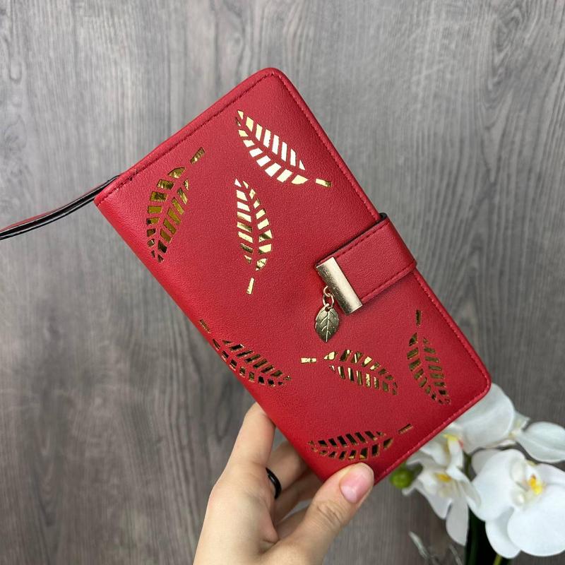 Качественный женский кошелек клатч, модный портмоне для девушек с листочками красный
