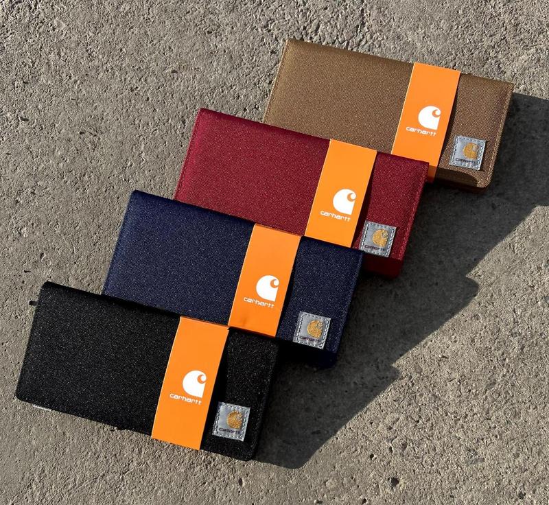 Портмоне CARHARTT WIP минималистичного дизайна в коробке. Стильный аксессуар американского бренда подойдет с усим. Имеет удобный функционал: -3 отделения для купюр, - 1 карман на замке для копейков, - 8 отделений для карточек, - закрывается на кнопку. Замеры: - высота 9,5 см (в сложенном виде) - длина 19 см - ширина 1,5 см