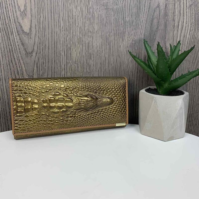 Кожаный женский кошелек крокодил, женский клатч-кошелек с крокодилом натуральная кожа золо...