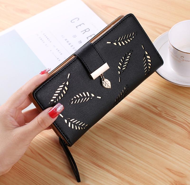 Женский кошелек, деккорирован вырезанными листочками. Размер 19,х9,5×3см. 12 отделений для карт. Отдельное отделение на молнии для купюр, телефона, мелочи. Удобный , функциональный и стильный аксессур.
