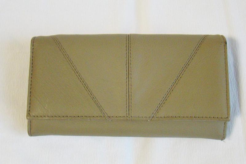 Натуральная кожа, подкладка текстиль. Цвет светлый оливковый. Есть отделение для мелочи и несколько отделений для купюр и карт. Снаружи два отделения, одно на молнии. Длина 18 см, высота 9,5 см, толщина 3 см.