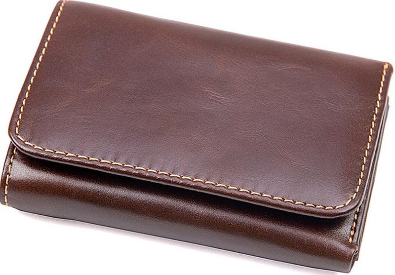 Размер (ШхВ, см.): 11x8; Материал: натуральная кожа; Цвет: коричневый. Удобный кожаный кошелек. Внутри кошелек имеет большой карман для купюр, которые помещаются в развернутом виде. Внутри кошелька имеется отделения для карточек и прозрачный карман для документов. Сам аксессуар складывается в два раза и закрывается на кнопку. На задней стороне аксессуара расположена монетница, которая предоставляет владельцу кошелька быстрый доступ к мелочи, не открывая при этом сам кошелек. Кошелек легко помещается в карман любых штанов и не занимает много места в сумке или средних размеров борсетки. Кошелек упакован в текстильный пылезащитный чехол.