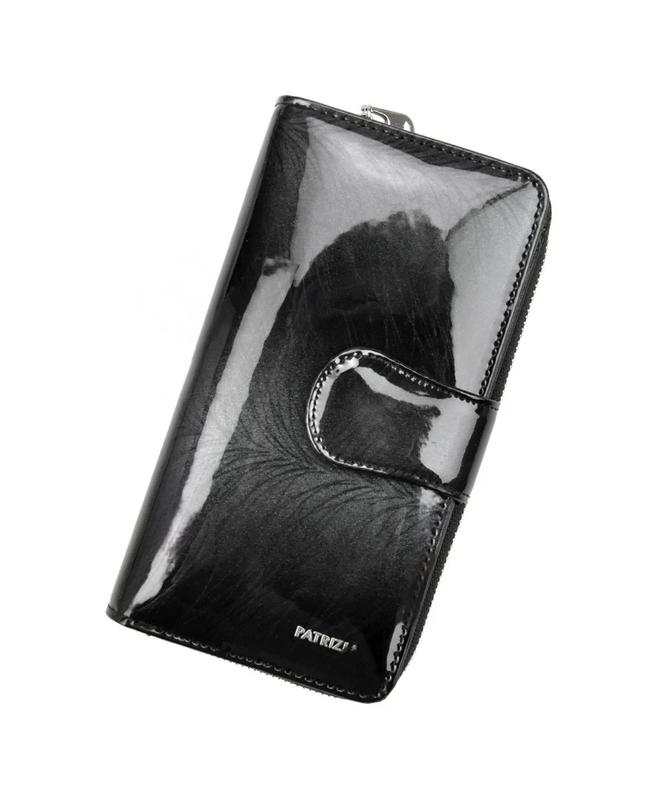 Великий жіночий гаманець, виготовлений з натуральної італійської лакованої шкіри найвищої якості. Конструкція гаманця: - вертикальна орієнтація, - два відділення для банкнот, - шістнадцять відділень для магнітних карт, - два «віконця» для фото, - кишеня для дрібниць, розділена на дві частини відділенням на блискавці, закривається на блискавку.