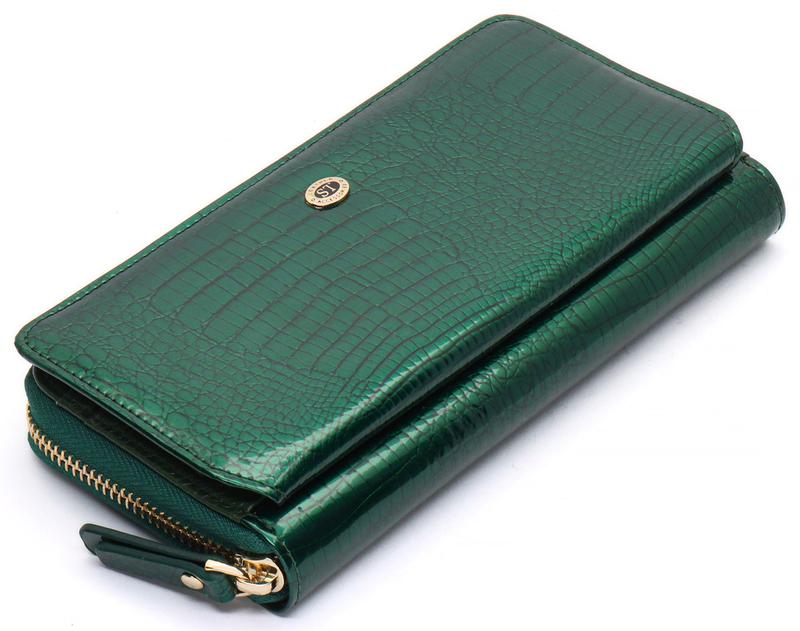 Гаманець зелений лаковий з натуральної шкіри із блоком для карток ST Leather S7001A Характеристики: - Матеріал: натуральна шкіра - Колір: зелений - Розміри (ШхВхГ, см): 20х9,5х3 Структура: - (3) три відділення для банкнот; - (18) вісімнадцять секцій для карт; - (3) три прилеглі кишені; - (1) одна внутрішня кишеня-перегородка на блискавці. Опис: Оригінальний гаманець сподобається багатьом жінкам, оформлений у зеленому кольорі, декорований візерунком під крокодилячу шкіру з лакованим покриттям. Основна частина закривається на блискавку, а додатковий блок для платіжних карток на кнопці. Внутрішнього простору достатньо для комфортного розміщення банкнот та монет, для яких є кишеня на блискавці. Фурнітура надійна металева, виконана в золотистому кольорі, а барвиста коробка від виробника дозволить використовувати аксесуар як подарунок. Із задоволенням відповімо на всі питання за телефоном або в месенджерах