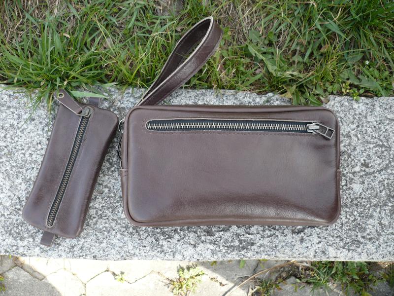 Комплект: клатч и ключница. Кожи ВРХ. Кожа гладкая с полуглянцевой лицевой поверхностью. Цвет - коричневый-шоколад. Прошитый вощеной нитью galaces 0,45 мм. Ручная работа. Клатч: размер 220*120*40 мм. Одно общее отделение с внутренним карманом и кармашком для карты, два внешних отделения на молниях. Молнии и собачки YKK (Япония). Ключница: размер: 140*65 мм. Молния и собачка YKK металлические (Япония). Ценность: 1900 грн