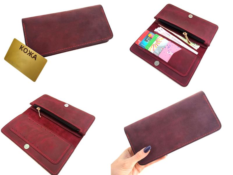 Гаманець із натуральної якісної шкіри. Складається з 2 повноцінних відділень для купюр та 1 відділення для валюти у складеному вигляді, 8 відділень для банківських та дисконтних карток, 1 повноцінне відділення на блискавці. Закривається ця модель на двох магнітних кнопках. ( Також можна зробити цю модель, щоб закривалася на одну кнопку посередині). Розмір: 19.5x10x2.5