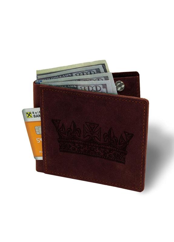 Кошелек из натуральной кожи с оригинальным рисунком нанесенным методом лазерной гравировки - стильный аксессуар от украинского производителя BermuD ™. В производстве используются только натуральная кожа «Крейзи Хорс», прочная нитка для кожи и качественная фурнитура. Благодаря этому кошелек будет долго служить владельцу. Кожа «Крейзи Хорс» по своим свойствам может иметь визуальные царапины и потертости, которые появляются и пропадают в процессе использования. Это придает изделию стиль ретро. Размер 11,5*9,0см. На лицевой стороне расположено отделение для записок, визитных карточек, денежных купюр мелкого достоинства. Внутри имеется одно отделение для купюр и 4 отделения для платежных и скидочных карт, в виде сквозных прорезей для уменьшения толщины кошелька. В каждое отделение для карточек вмещается от 1 до 2 карт. Кнопки-магниты обеспечивают надежную фиксацию и удобство в использовании. Материал - натуральная кожа «Крейзи Хорс». Размеры - 11,5*9,0см. Карманы для купюр - 1 шт. Отделения для карточек - 4 шт. Вид застежки - магниты.
