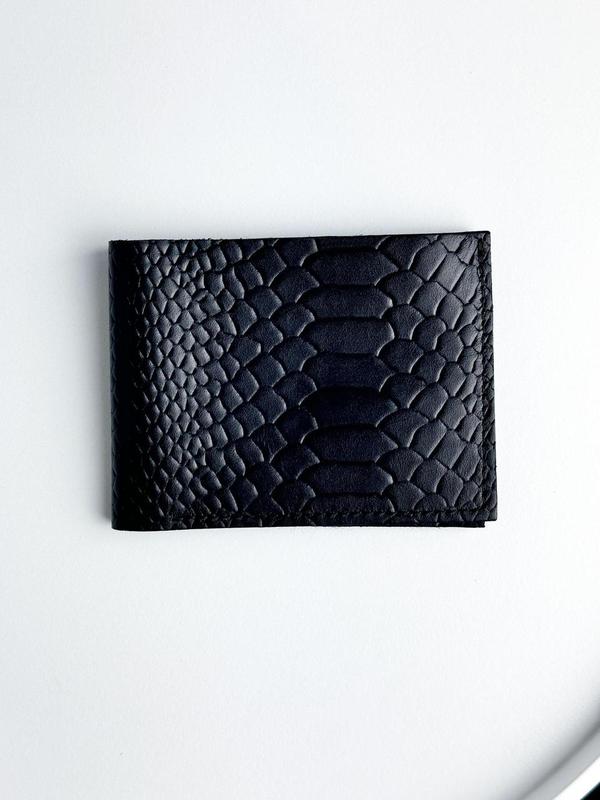 Наш чорний чоловічий гаманець-біфолд з натуральної шкіри із тисненням "пітон" - це елегантний аксесуар, що поєднує в собі стиль і практичність. Виготовлений з високоякісної натуральної шкіри, цей гаманець-біфолд вражає своєю вишуканістю та якістю. Гаманець-біфолд має достатньо відділень для зберігання готівки, карток, документів та інших необхідних предметів, що забезпечує організованість і зручність. Тиснення "пітон" надає йому особливого шарму і елегантності, роблячи його стильним аксесуаром для вашого образу. СТРУКТУРА: • одне відділення для купюр • 6 осередки для карток ХАРАКТЕРИСТИКИ: - Матеріал: натуральна шкіра - Вид шкіри: пітон - Колір: чорний - Тип моделі: біфолд - Фурнітура: відсутня - Розмір: (В*Ш*Г) - 8,5см*11,5см*1см