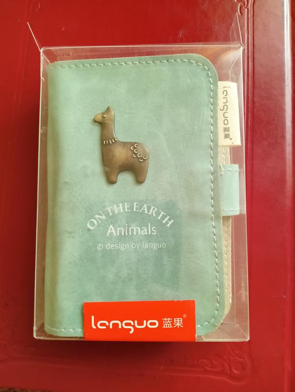 Милая вещь, цвет мятный, как нубук (может и нубук), мягкая обертка, в упаковке. Застежка на кнопке. Количество вкладышей 10 ширина 6.5 см высота: 10.5 см глубина без визиток 2 см