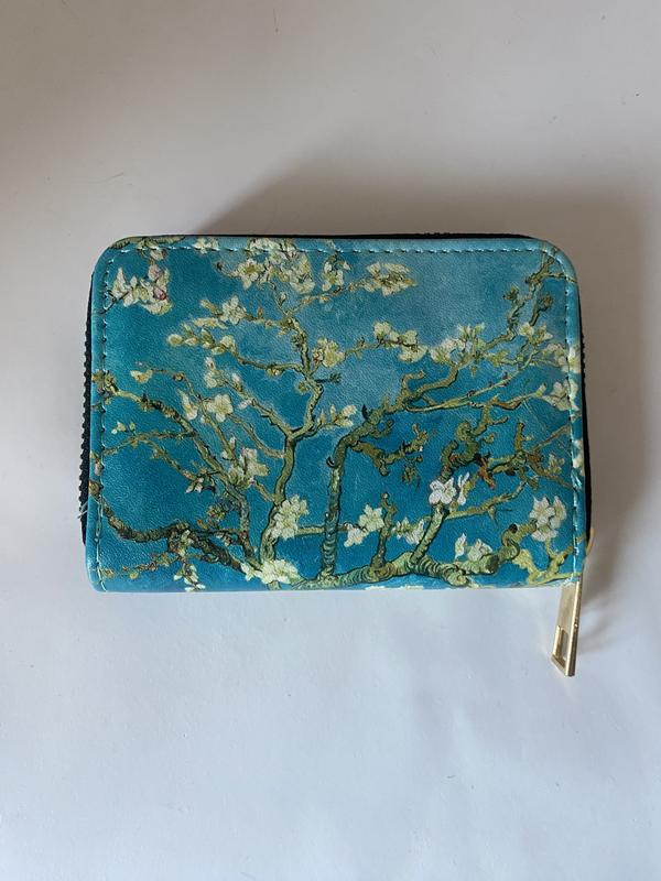 Продам візитницю (гаманець) із принтом картини Ван Гога "Квітучий мигдаль". Опис: Гаманець має застібку-блискавку по периметру та багато відділень для кредитних карток. Дизайн: Принт зображує фрагмент всесвітньо відомої картини "Квітучий мигдаль" Вінсента Ван Гога, на якій зображені квіткові мотиви на тлі м'якого блакитного весняного неба. Заміри: на фотографії. Матеріал: шкір замінник. Фурнітура: золотистого кольору.