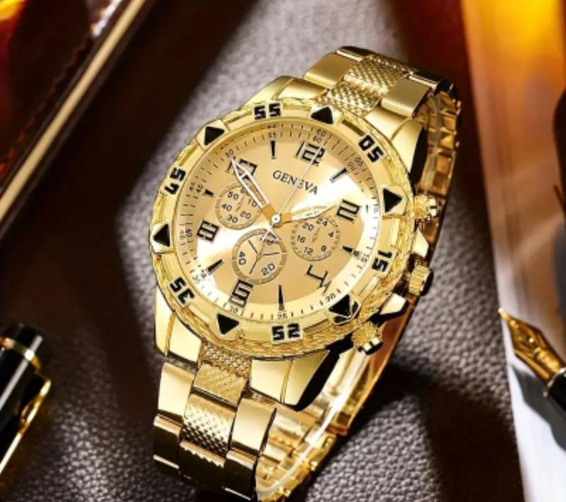 мужские часы Geneva, которые имеют золотой циферблат и браслет. Новые