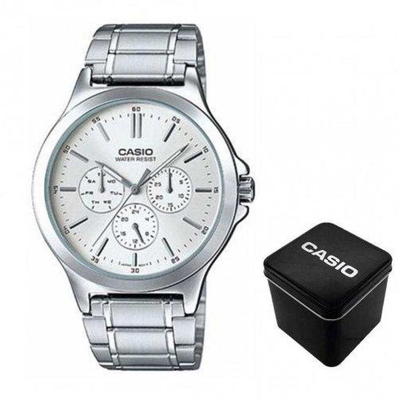 🕰️ Мужские часы Casio TIMELESS COLLECTION MTP-V300D-7AUDF - элегантная классика с хронографом Стильный и универсальный мужские часы Casio MTP-V300D-7AUDF из коллекции Timeless Collection -- это сочетание японского качества, точности и классического дизайна. Эта модель создана для тех, кто ценит минимализм, надежность и элегантность в каждой детали. Корпус изготовлен из латуни с хромированным покрытием, которое придает часам благородный серебристый блеск. Серебристый циферблат с четкими индексами подчеркивает классический характер модели, а дополнительные мини циферблаты отражают дату, день недели и формат времени 24h. Минеральное стекло устойчиво к царапинам и надежно защищает циферблат от ежедневных нагрузок. Браслет из нержавеющей стали с классической застежкой обеспечивает комфортную носку и долговечность. Внутри - японский кварцевый механизм Casio, что гарантирует стабильную точность хода. Благодаря водозащиту 30 WR, часы не боятся дождя или брызг воды, поэтому подходит для ежедневного использования. Модель Casio MTP-V300D-7AUDF -- это отличный выбор для современного мужчины, который ищет качественные, элегантные и доступные часы для любого случая. * * * ✅ Достоинства модели: - Оригинальный японский дизайн Casio Timeless Collection - Кварцевый механизм -- точность и надежность - Серебристый корпус и браслет из нержавеющей стали - Минеральное стекло, устойчивое к царапинам - Индикация даты, дня недели и 24-часовой формат - Водозащита 30 WR -- защита от дождя и брызг - Стильный классический дизайн - идеально подходит к любому образу - Официальная гарантия 2 года * * * 🧭 Характеристики: - Бренд: Casio - Коллекция: Timeless Collection - Стать: мужской - Тип механизма: кварцевый - Батарейка: SR920SW - Страна складывания: Китай - Корпус: латунь, серебристый - Диаметр корпуса: 41.5 мм - Толщина: 8.6 мм - Стекло: минеральное - Циферблат: серебристый, индексы - Браслет: нержавеющая сталь - Водозащита: 30 WR - Формат времени: 12 годин - Дополнительно: индикация даты, дня недели, 24h