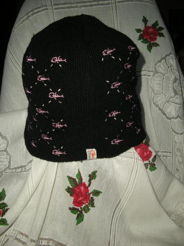 Стильная шапка,фирменная,двойная вязка,теплая,впереди козырек,сзади фирменная лейба,на черном фоне в белого цвета квадратиках розовые рыбки,объем головы-64см.,шапка может еще тянуться.