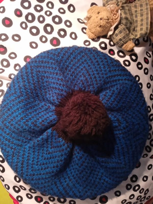 подвійна в'язка, теплий, легкий, стан нового, длина 19, без помпона, з ним 24,пог 17, на резинці м'якій, колір яскравий синій з чорним насичений, дуже гарна.