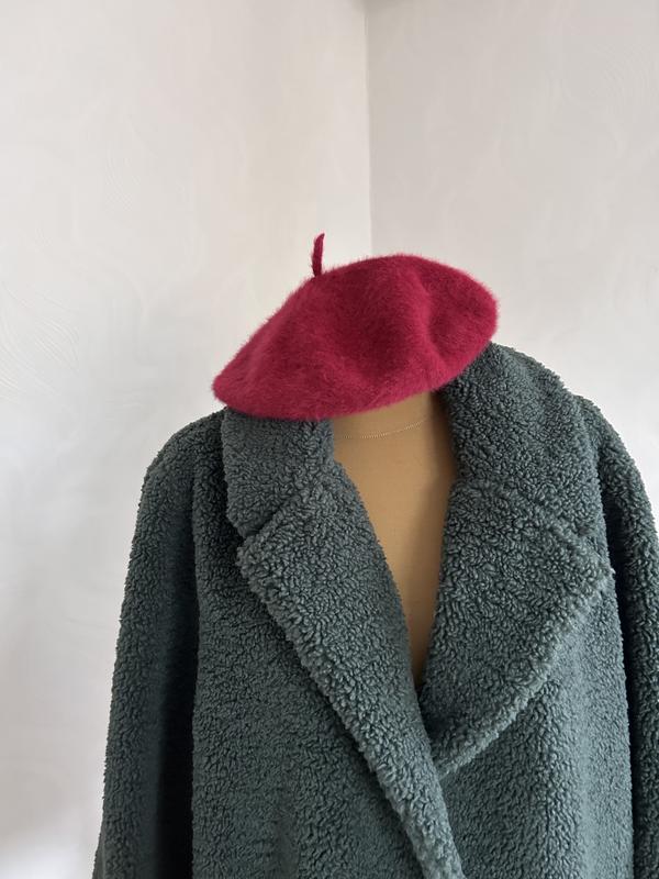 Теплый берет малинового цвета из шерсти, будь-какие бирки отсутствуют,стан отменный,без дефектов, замеры на фото,ткань тянется, подойдут на объем головы 55-59см.