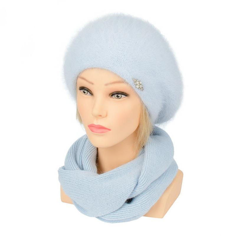 Женский вязаный берет из натуральной ангоры голубого цвета , сезона осень - зима , от торговой марки Yuan Meng , в модном дизайне женских вязаных головных уборов . В составе качественная натуральная ангора : 70 % ангора , 15 % шерсть и 15 % акрил . Модель берета двойной вязки , без ножки , поле берета среднего объема 27.5 - 28 см . Берет однотонный , сбоку небольшое украшение в виде брошки. Модель берета связана из двух слоев : верхний слой из ангоровой нити с ворсом , внутренний слой из нежной мягкой натуральной шерсти с добавкой вискозы, подходит для всех типов кожи ( в том числе и чувствительной ) Характеристика вязаного полотна : плотная петля среднего размера , ворс ангоры густой высота столбика 3 - 5 мм Берет хорошо держит форму , мягкий и приятный на ощупь за счет качественной шерсти , комфортный в носке . Размер берета универсальный : 56 - 57 + . Цвета модели берета в нашем интернет магазине женских вязаных головных уборов : бежевый светлый ( ваниль ) - серый светлый - голубой светлый - белый - пудра светлый ( розовый жемчуг ) - пудра темный ( пыльная роза ) .