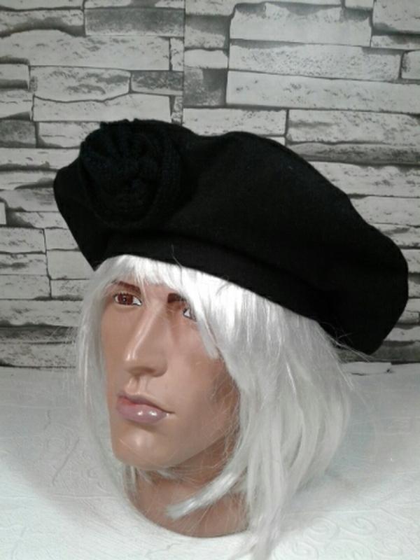 Берет Цвет черный. Тканина-віскоза,вовна Обєм-58,5 см. Ширина бортика с ножкой-10см Декор-цветок из трикотажной ткани черного цвета. Подкладка-полиэстер.