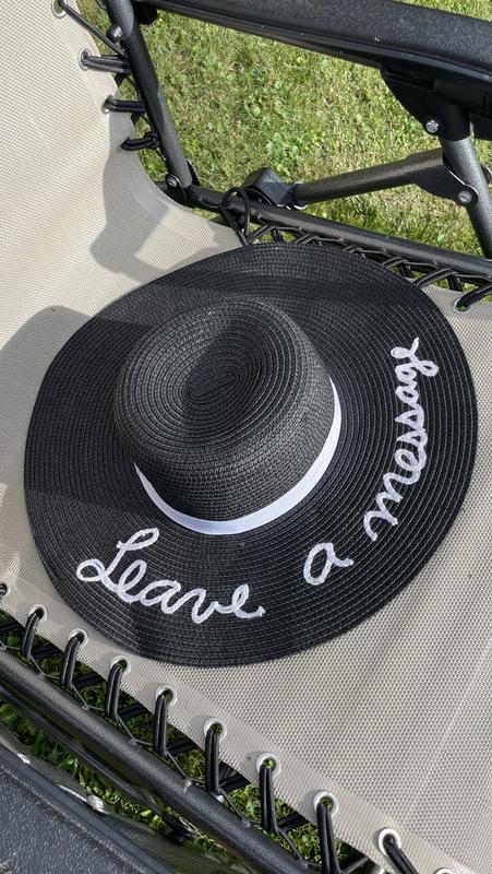 Стильний чорний капелюх із широкими полями та білим вишитим написом “Leave a message”. Декорований білою стрічкою. Легкий і зручний, ідеальний для відпочинку на пляжі чи прогулянок у сонячну погоду.