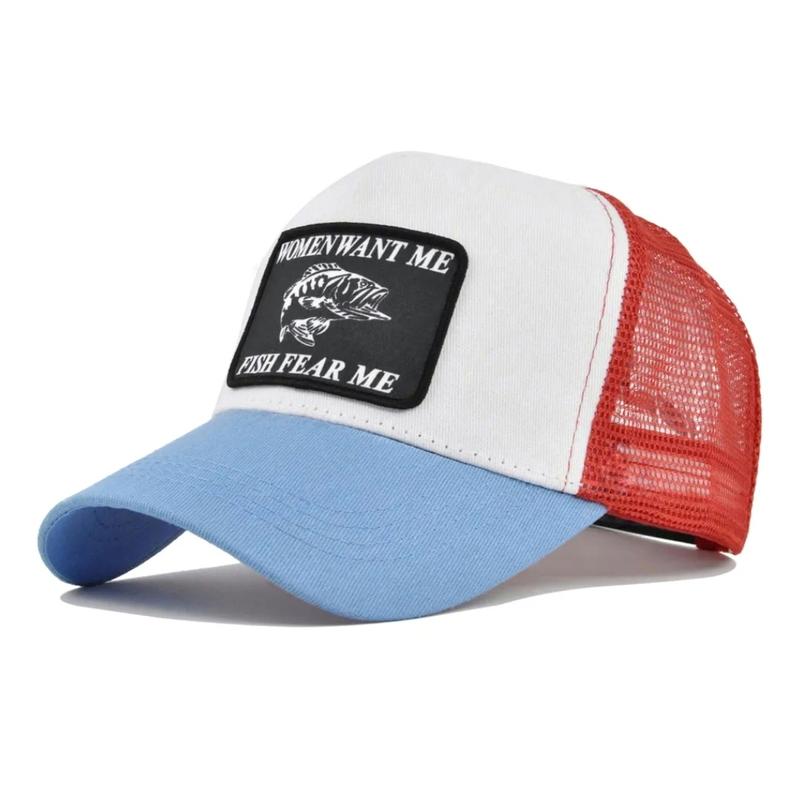 Кепка тракер рыба, fish, (женщины хотят меня-рыби боятся меня) с сеточкой голубая, унисекс
