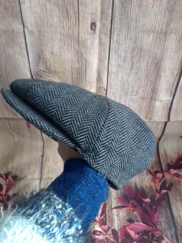 Автентичний головний убір Peaky Blinders 85% вовна, 15% поліестер, підкладка поліестер Розмір L 59см Сіра восьмиклінка у велику ялинку, посередині гудзик обтягнутий тканиною, козирок на кнопці