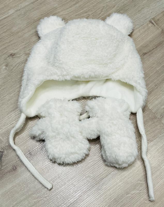Новий чудовий комплект шапка + рукавички від C&A. Теплий, м’якесенький, приємний до тіла. Шапка на зав’язках, з милими вушками. Рукавички з’єднані шнурівкою, дуже теплі. Розміри: 80 см - на обхват голови 48-49 см та 86 см - на обхват голови 50-51 см.