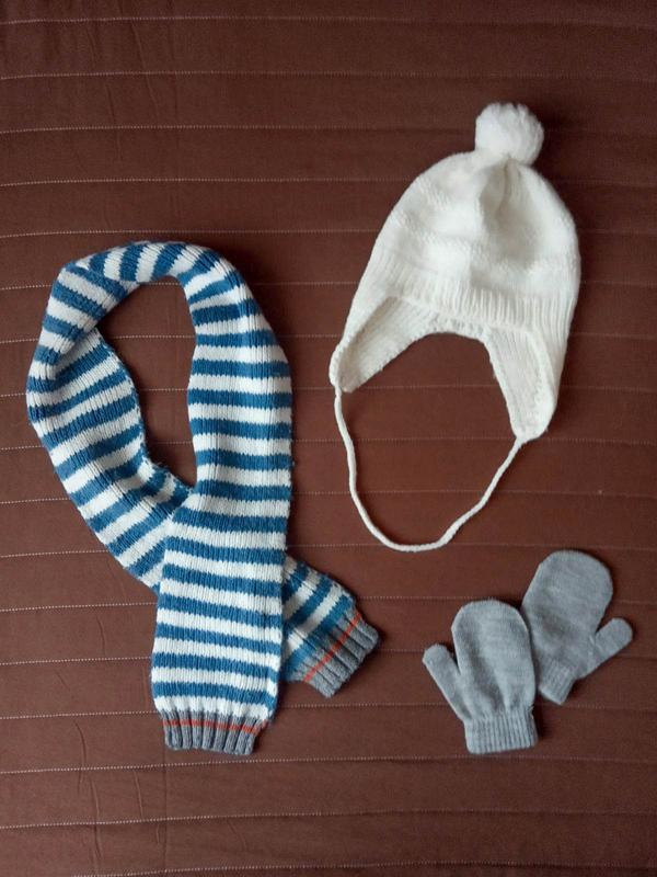 Збірний комплект на хлопчика 1-2 роки ● Біла шапочка з бумбоном молочного відтінку ручної в’язки; ● Смугастий шалик Vertbaudet машинної в’язки у синьо-білих тонах із сірим та помаранчевим акцентом; ● Cірі рукавички від Smile .(заміри на фото та в описі) Сезон: пізня Осінь / Зима / рання Весна ЗАМІРИ ШАПОЧКИ – глибина ззаду16 см, спереду 15 см – ширина в основі 19 см ШАЛИК – повна довжина 100 см – ширина 10 см РУКАВИЧКИ – повна довжина 12 см