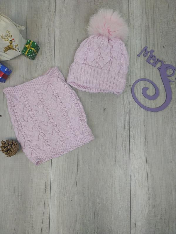 Комплект шапка и снуд для девочки kraft вязаный на флисе с помпоном зимний розовый размер...