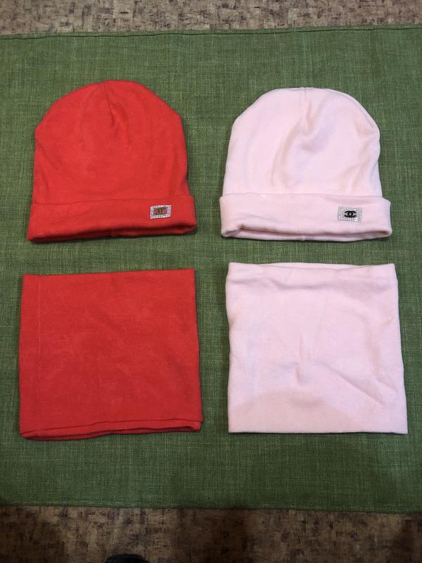 Комплект В комплекте шапка-бини и снуд, двухслойные В наличии два комплекта, разного цвета Замеры: шапка - бьем по низу 50 см; высота: 23 см; снуд - объем 52 см; высота 22 см; Тканина: 40% вовна; 60% акрил Цвет: коралл; бледно-розовый