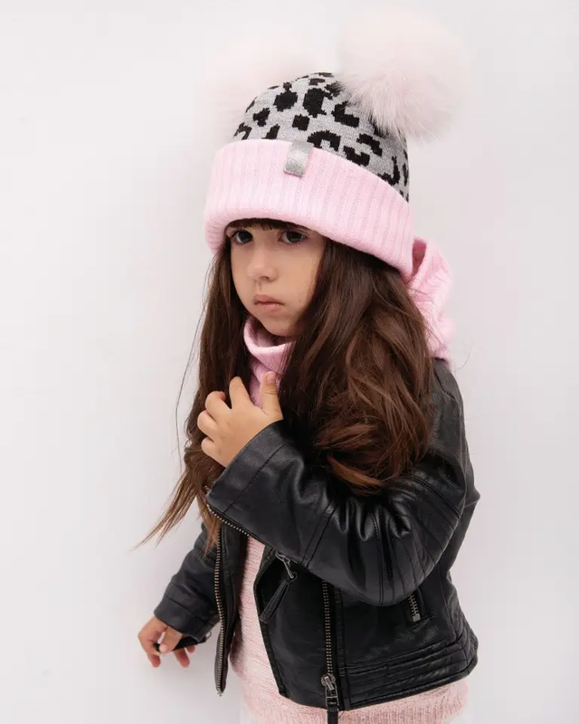 Стильный комплект для девочки Ханна (шапка+хомут) Размер: 46 (1-1,5 года) Состав :верх-акрил 100%, Низ: хлопок 95% , эластан 5%. Оригинальный комплект для маленькой девочки. В набор входит объемная теплая шапочка с отворотом. Изделие выполнено в комбинации 2-х цветов и украшено двумя большими меховыми помпонами. Хомут выполнен из трикотажа в тон отворота шапочки и позволяет защитить шею малышки.