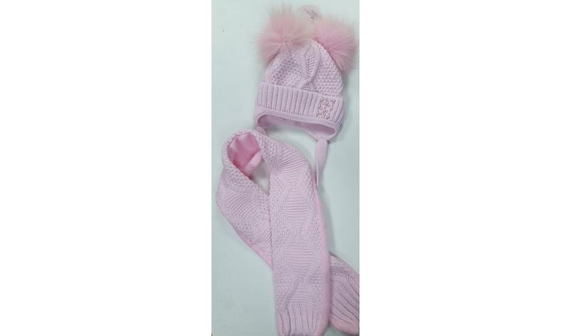 Шапка с шарфиком для девочки на завязках 3-12м. с натуральными меховыми бубонами, флис под...