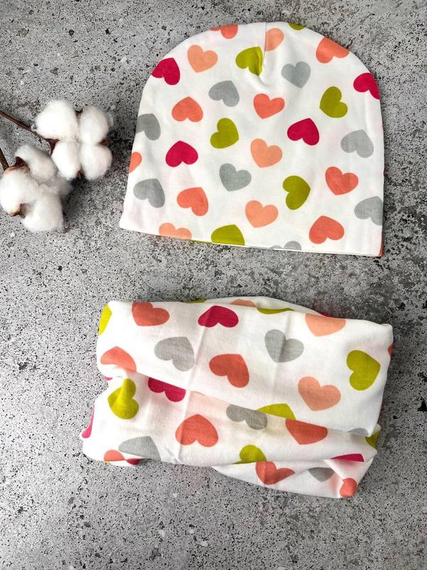 Дитячий весняний трикотажний набір , шапка та хомут до 2-ох років, "різнокольорові сердця...
